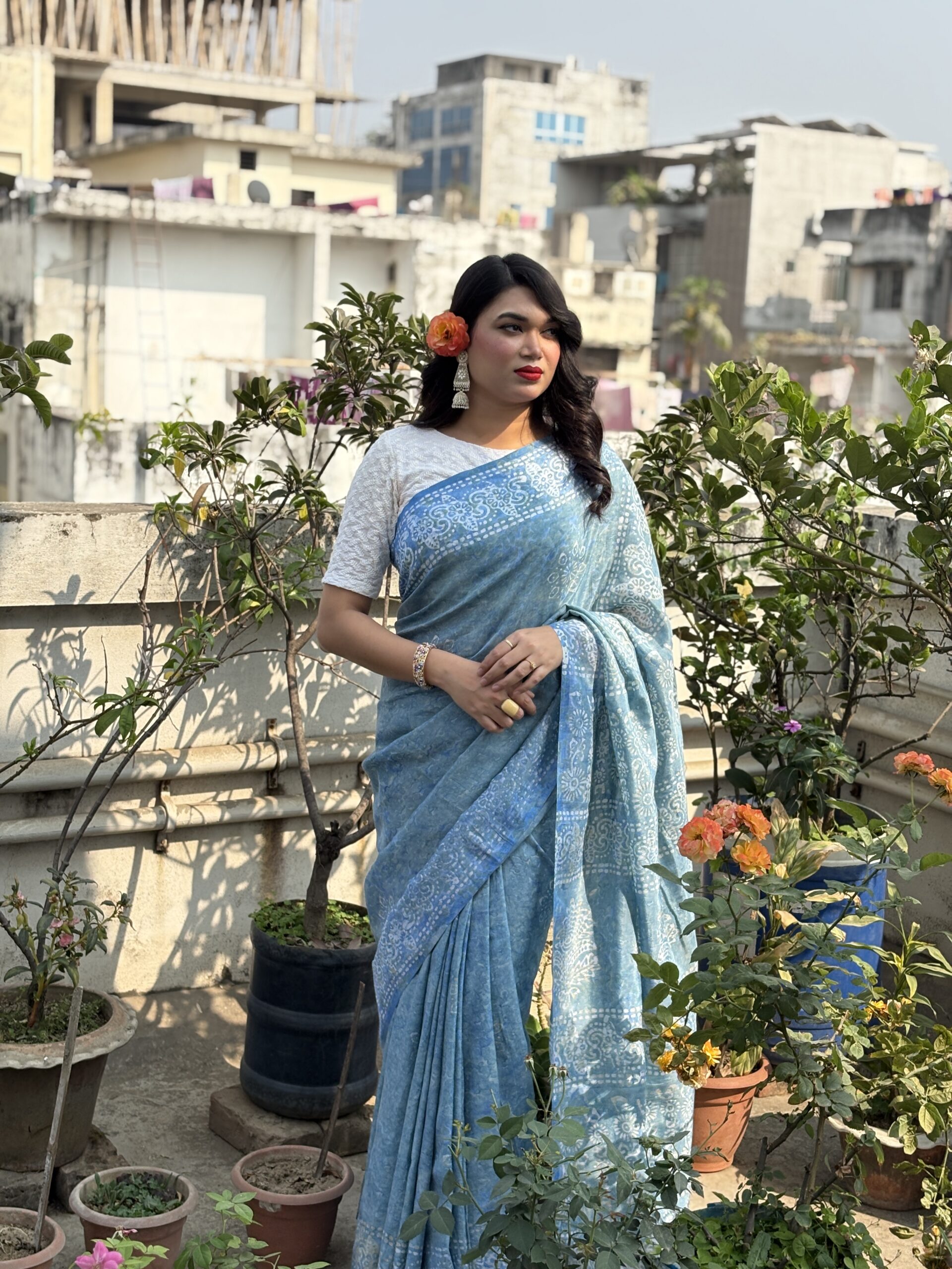 Dark brown, and blue tie-dyed silk saree with blue wax dyes. Comes with matching unstitched blouse piece attached at the end of saree. Blouse shown in the photo is a styling suggestion, it is not a part of the actual product.